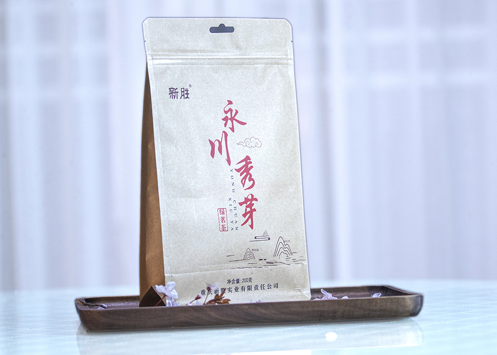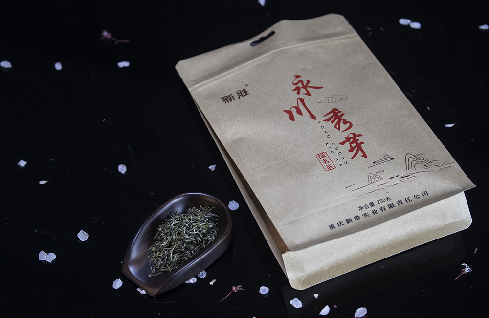 新胜·永川秀芽的原料基地坐落于气候温润、雨量充沛、常年云雾缭绕,具有亚热带气候特点的西山黄泥塘片区,茶树品种以“老川茶”,“福选九号”等多个优良品种为主,鲜叶采摘标准以一芽一叶初展为主,要求芽叶完整,新鲜,洁净。加工工艺分为捡剔、摊凉、杀青、揉捻、初烘、做形、复烘、提香、精选等多道工序。