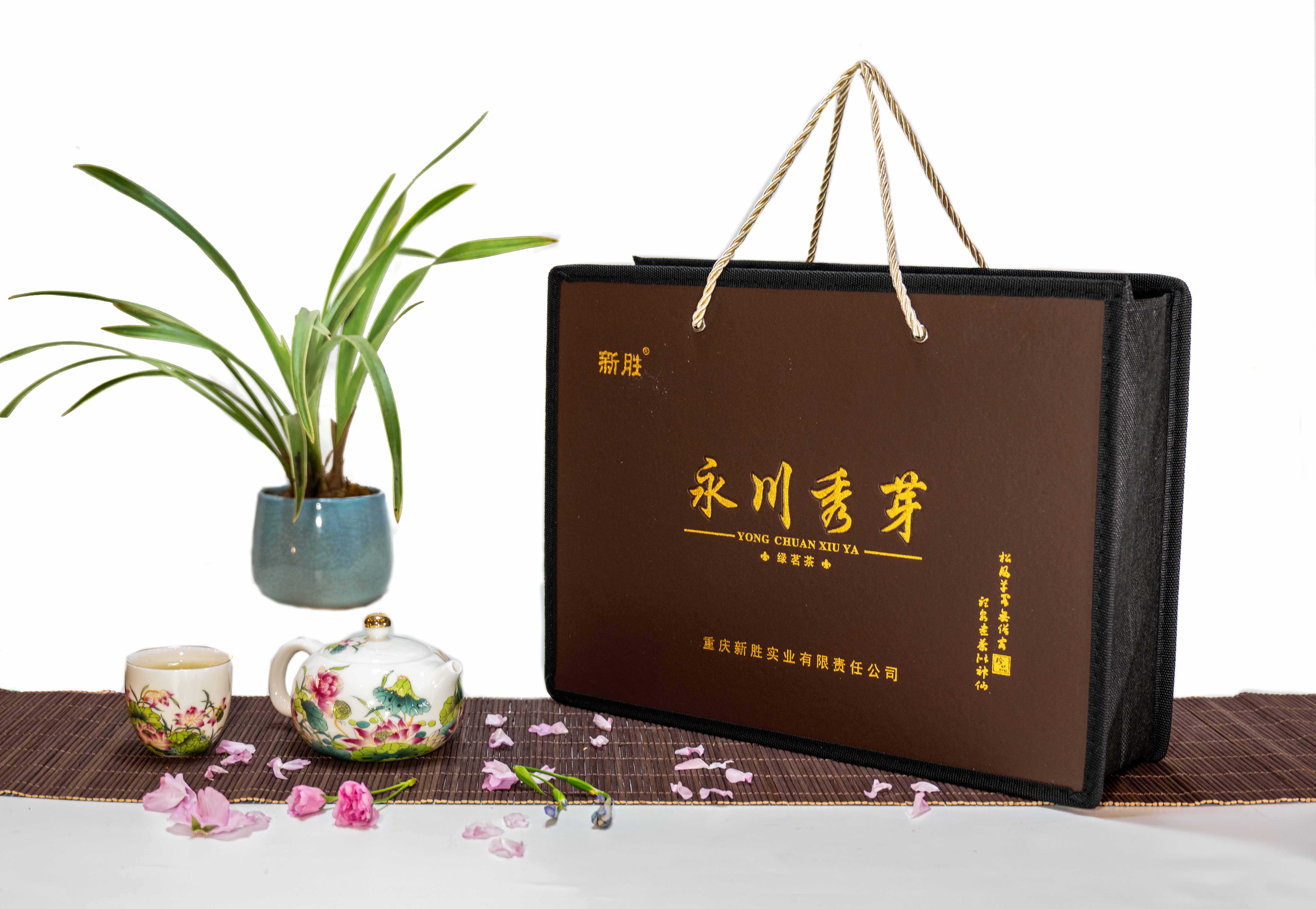 新胜·永川秀芽的原料基地坐落于气候温润、雨量充沛、常年云雾缭绕,具有亚热带气候特点的西山黄泥塘片区,茶树品种以“老川茶”,“福选九号”等多个优良品种为主,鲜叶采摘标准以一芽一叶初展为主,要求芽叶完整,新鲜,洁净。加工工艺分为捡剔、摊凉、杀青、揉捻、初烘、做形、复烘、提香、精选等多道工序。