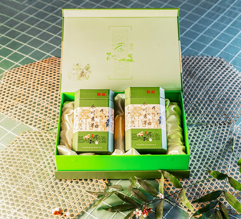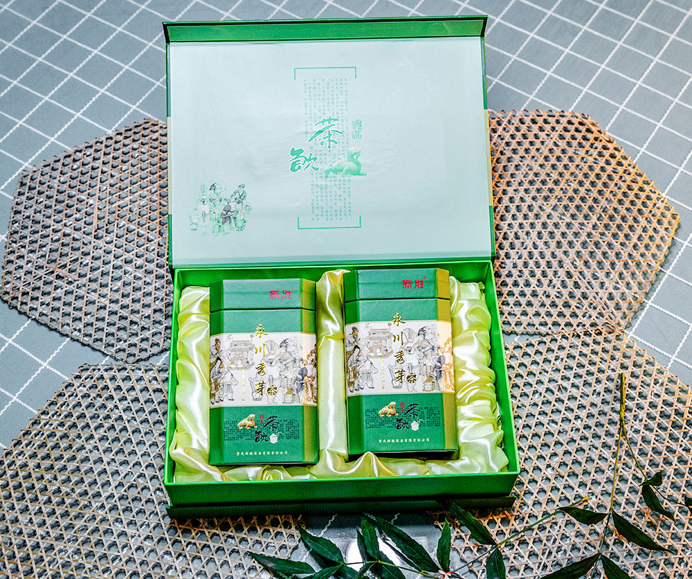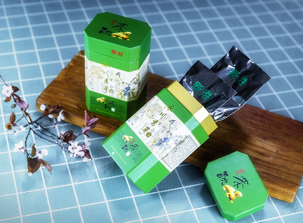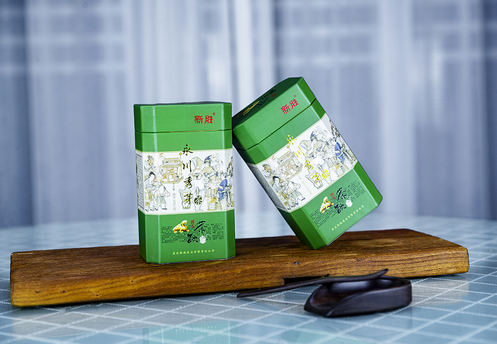 新胜·永川秀芽的原料基地坐落于气候温润、雨量充沛、常年云雾缭绕,具有亚热带气候特点的西山黄泥塘片区,茶树品种以“老川茶”,“福选九号”等多个优良品种为主,鲜叶采摘标准以一芽一叶初展为主,要求芽叶完整,新鲜,洁净。加工工艺分为捡剔、摊凉、杀青、揉捻、初烘、做形、复烘、提香、精选等多道工序。