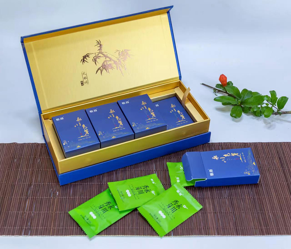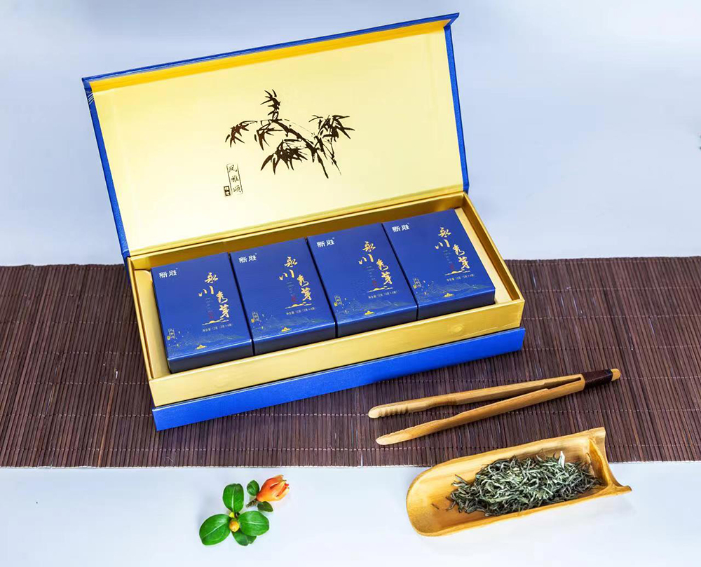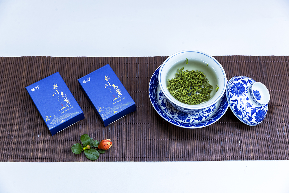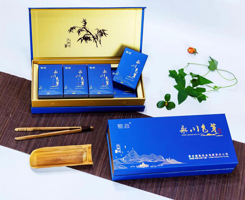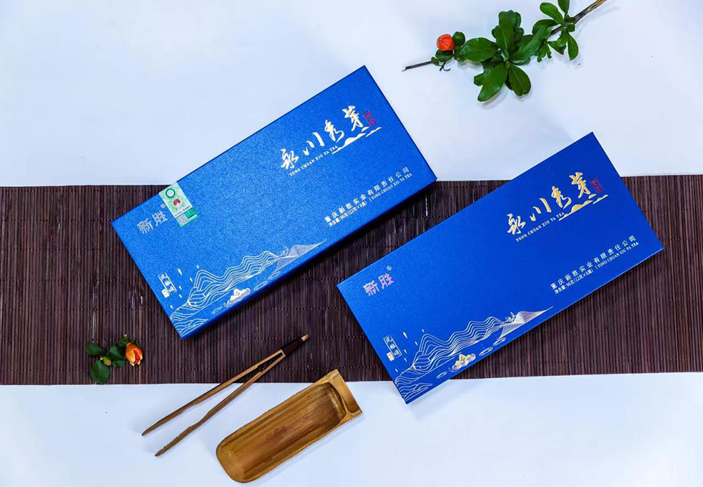 新胜·永川秀芽的原料基地坐落于气候温润、雨量充沛、常年云雾缭绕,具有亚热带气候特点的西山黄泥塘片区,茶树品种以“老川茶”,“福选九号”等多个优良品种为主,鲜叶采摘标准以一芽一叶初展为主,要求芽叶完整,新鲜,洁净。加工工艺分为捡剔、摊凉、杀青、揉捻、初烘、做形、复烘、提香、精选等多道工序。