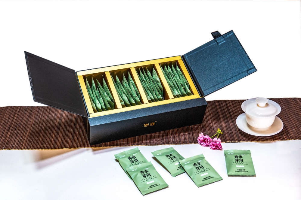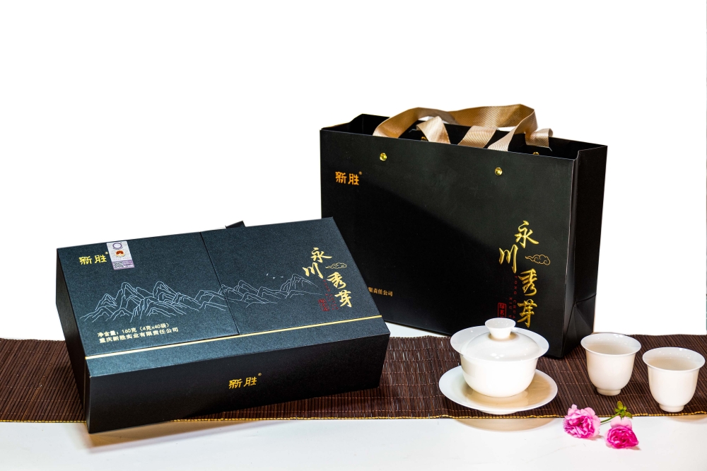 新胜·永川秀芽的原料基地坐落于气候温润、雨量充沛、常年云雾缭绕,具有亚热带气候特点的西山黄泥塘片区,茶树品种以“老川茶”,“福选九号”等多个优良品种为主,鲜叶采摘标准以一芽一叶初展为主,要求芽叶完整,新鲜,洁净。加工工艺分为捡剔、摊凉、杀青、揉捻、初烘、做形、复烘、提香、精选等多道工序。